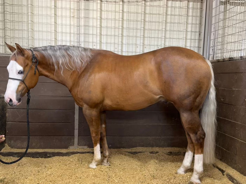Adam is not only gorgeous - he's well bred, incredibly talented, and amazingly level-headed. He's a dark, golden palomino with a big white face and two stunning blue eyes - complete with black eyeliner! He has chrome marked legs and a bright white mane and tail. Adam is 14.2 hands of man crush! Check out his pedigree - He is ROYALLY bred. Adam is a great mover and has a ton of athleticism. He has a lot of talent - stops with ease, and is a big turner. He circles softly, low headed. He is amazing for the ranch riding events also, as his long trot is to die for. Adam is bombproof, nothing phases him. Adam is paid up in all the major NRHA Reining Aged Events and can be registered with APHA as well as AQHA for those looking to show in the Paint Horse circuit as well. He's completely sound and honestly we cannot say enough good things about this one!